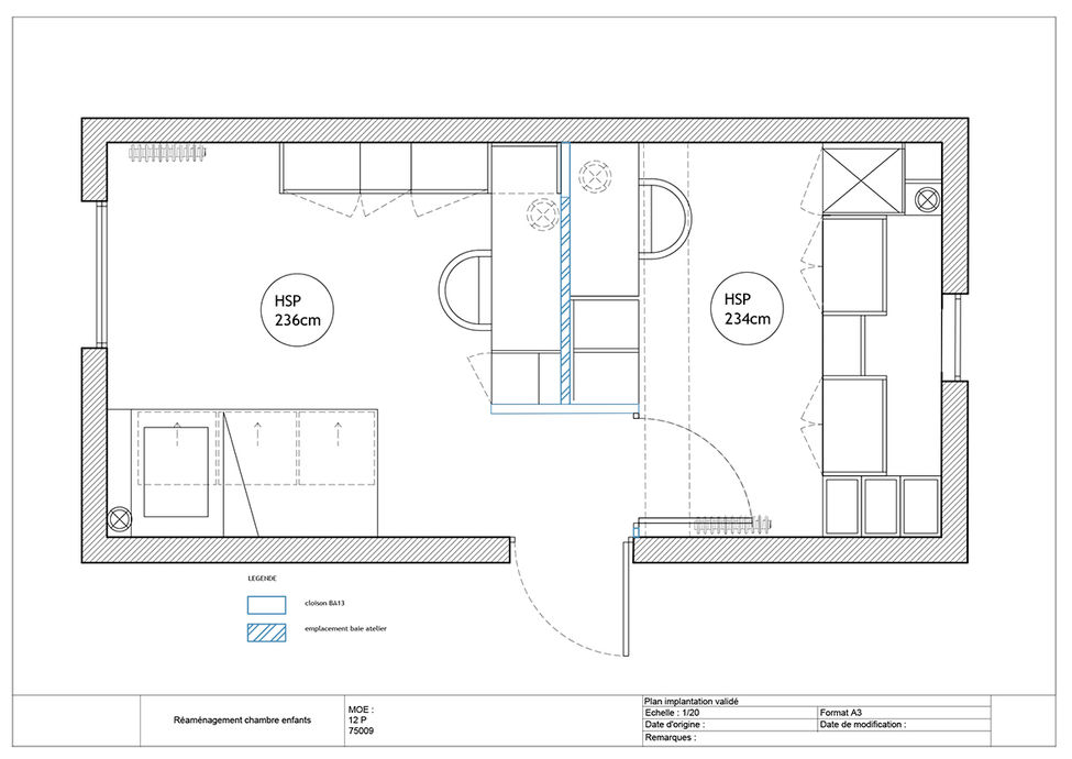 Aménagement de 2 chambres enfants dans une pièce qui était initialement un seul et même espace + création d'un dressing sur-mesure dans la chambre parentale.